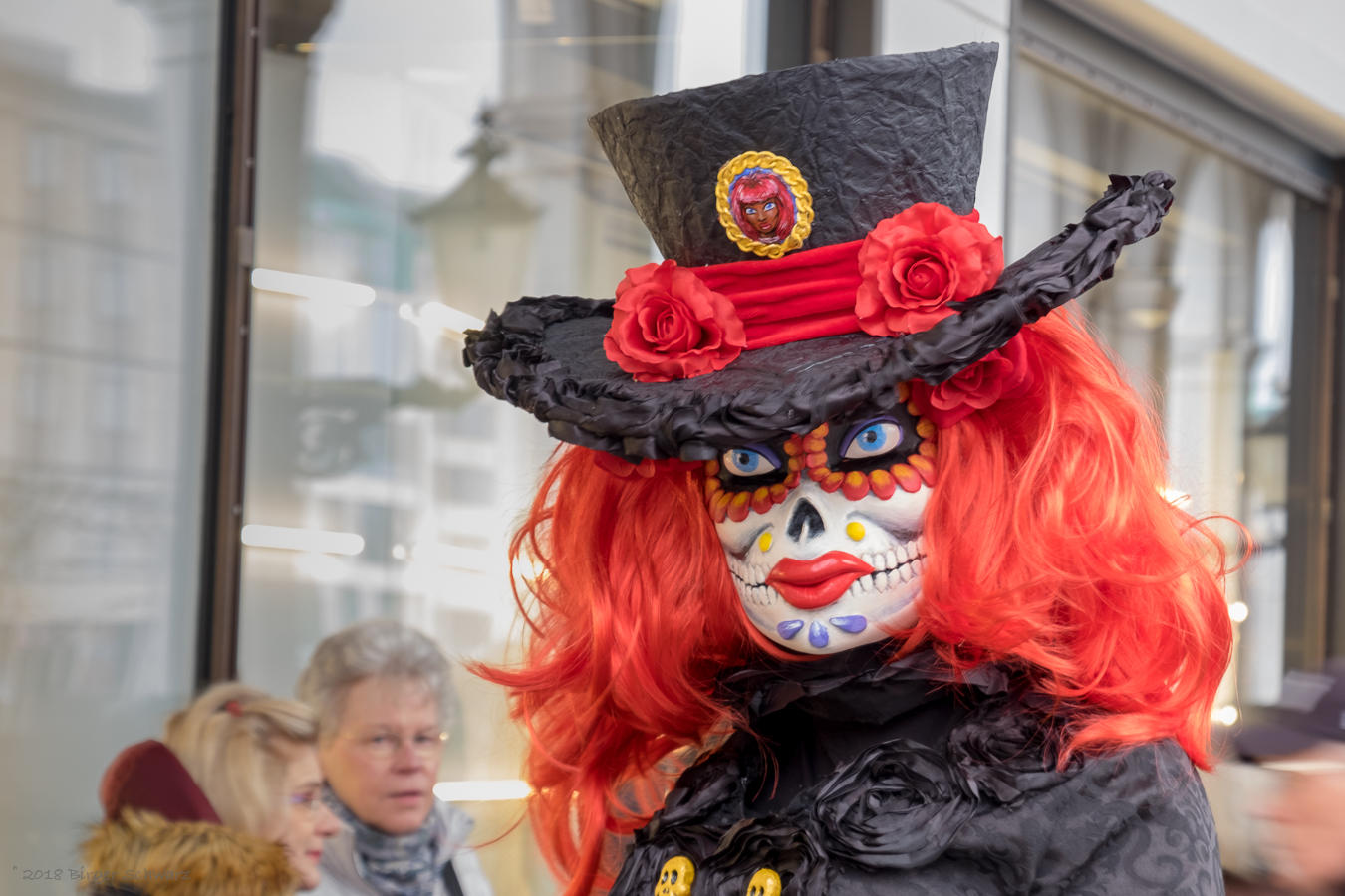 Farbenfroher, venezianischer Flair in Hamburg. Maskierte Damen und Herren flanieren entlang der Alsterarkaden in klassischen venezianischen Kostümen.